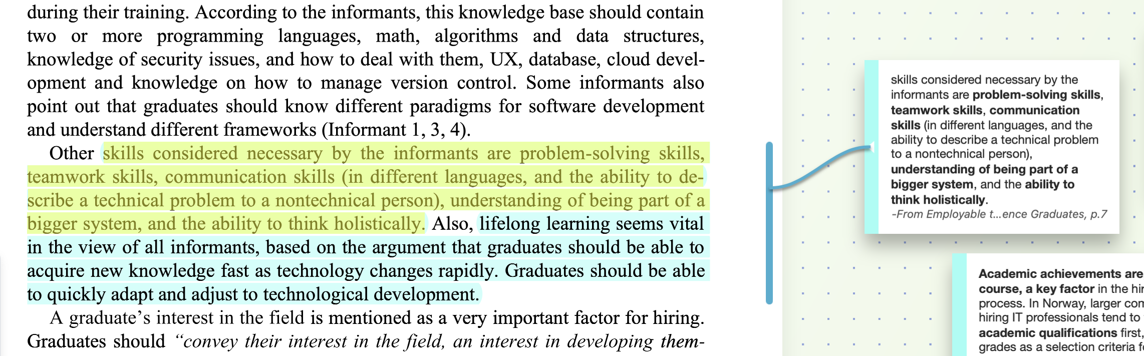 After the sources are imported, LiquidText offers a very nice feature to interact with them: apart from the standard PDF viewer, there are workspaces that are quite similar to those you can find in Miro, for example.