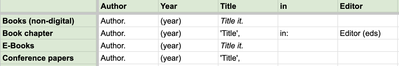 So, I created a table to visualize the styles. While this didn’t exactly help me understand the rules, it did at least show what components I needed for each type of reference.